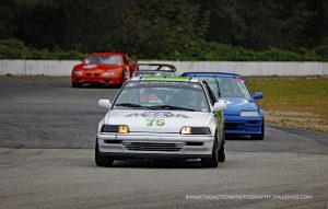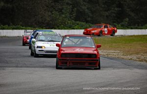 Braking hard! Jon Wright (1990 BMW E30), Gayle Baird (1991 Honda Civic), Duncan Anderson (1991 Chevrolet Camaro), Nicoleen Kirsten (1988 Honda Civic), and Gunther Ruppel (1960 Austin Healey Sprite) lead the rest of the pack into Turn 1. – Brent Martin photo